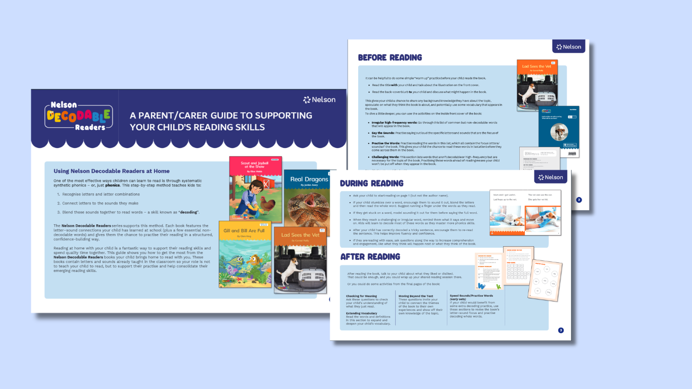 - Download this guide to Nelson Decodable Readers to find out how to use our readers at home. Written specifically for parents and carers, the guide unpacks the role of parents/carers when children are learning to read, how to use the activities included in each book, and how to make the most of reading the text - including what to do when a tricky word appears!