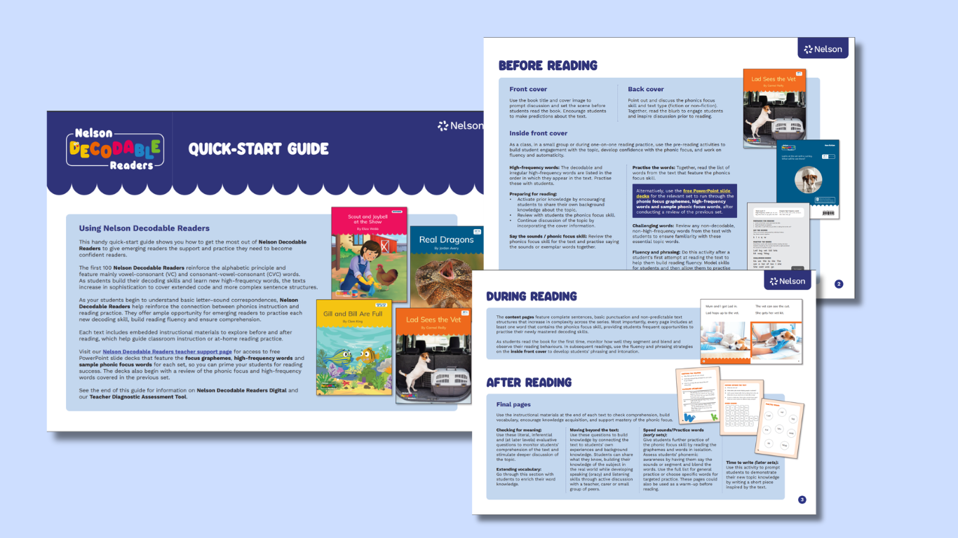 - Download a quick-start guide to find out how to get the most out of our Nelson Decodable Readers including how best to use the pre- and after-reading activities to build fluency, vocabulary and comprehension. Includes instructions for using our Teacher Diagnostic Assessment Tool.